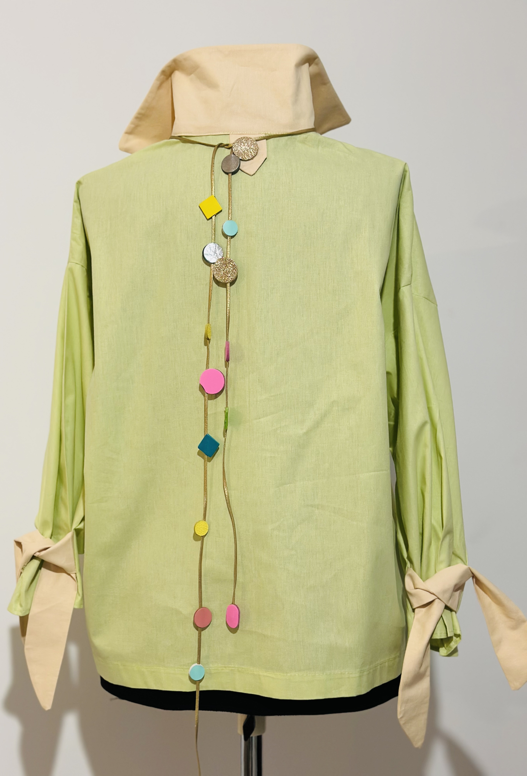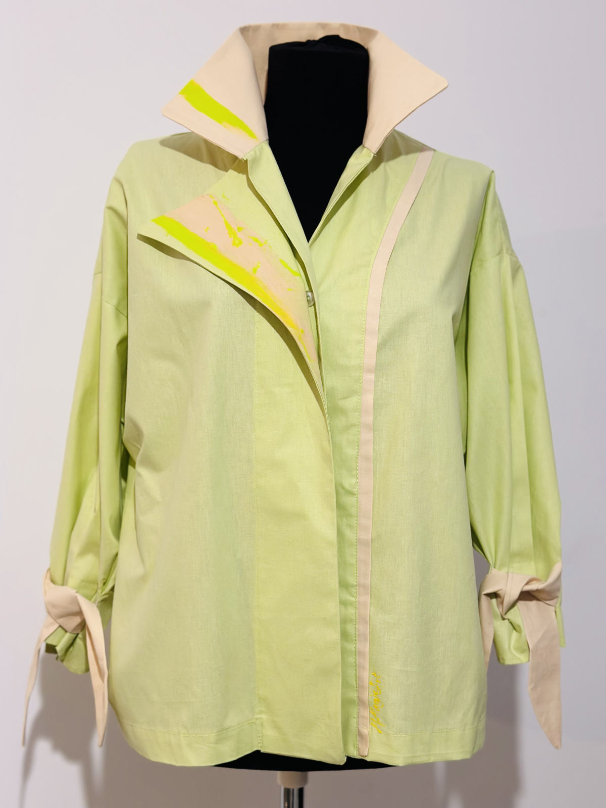 Cămașă în nuanțe superbe de fistic și somon, pictata manual cu produse de cea mai bună calitate, special create pentru pictură pe textile, rezistente la apă și transfer. Poate fi purtată simplă cat și cu accesoriile din piele naturală MMagic Art.