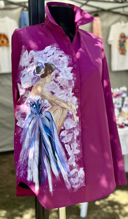 Cămașă pictata manual cu produse de cea mai bună calitate, special create pentru pictură pe textile, rezistente la apă și transfer.
