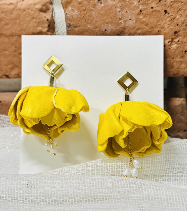 Acesti cercei spectaculoși , creați manual din piele naturală, impresionează prin designul floral tridimensional și nuanța vibrantă de galben solar.