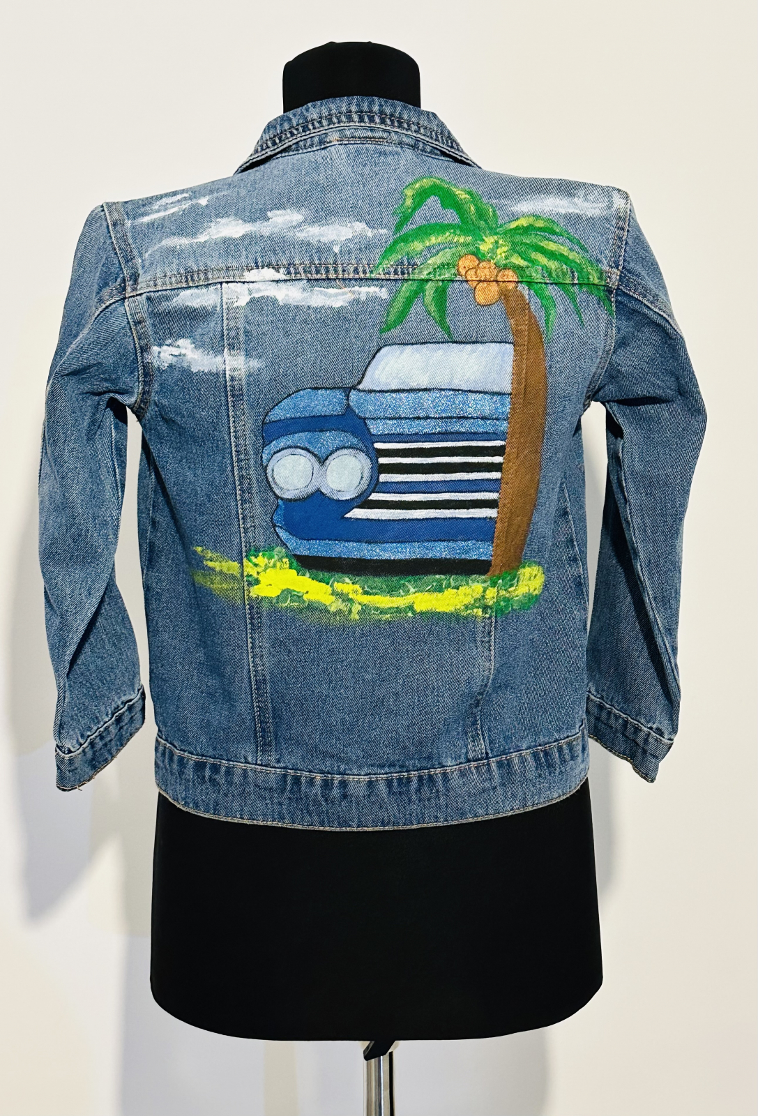 Geacă de blugi pictată manual cu produse de cea mai bună calitate, special create pentru pictură pe textile, rezistente la apă și transfer.