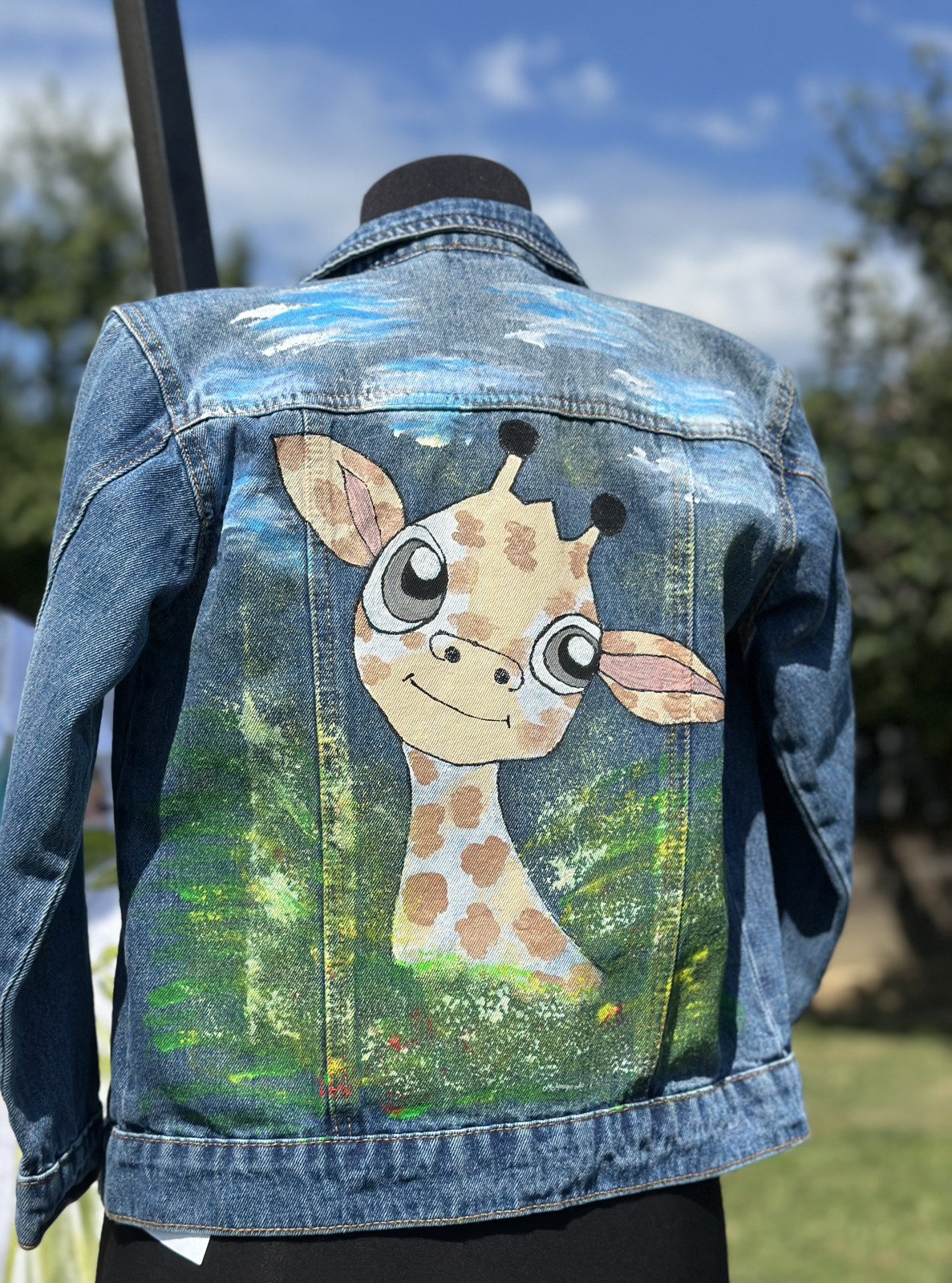 Geacă de blugi pictată manual cu produse de cea mai bună calitate, special create pentru pictură pe textile, rezistente la apă și transfer.