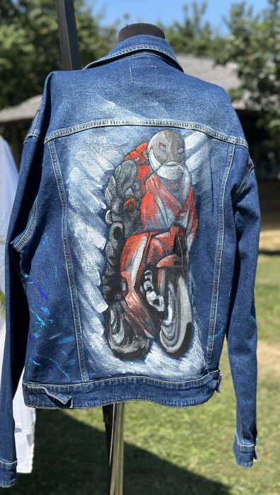 Geacă de blugi pictată manual cu produse de cea mai bună calitate, special create pentru pictură pe textile, rezistente la apă și transfer.