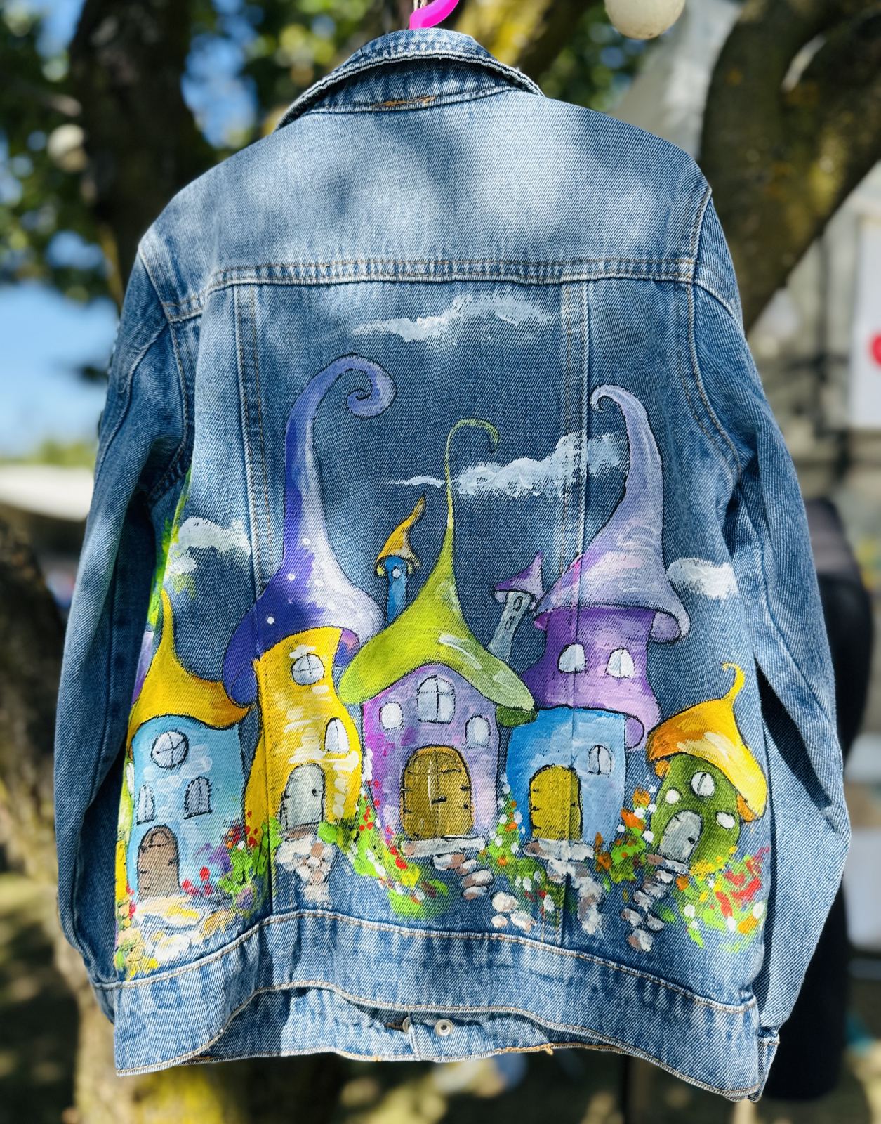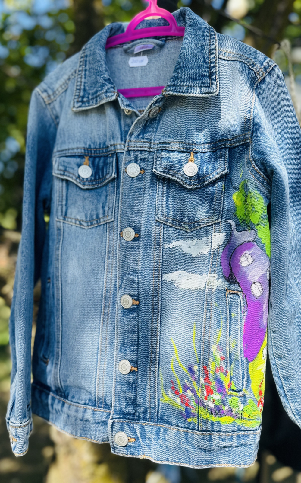 Geacă de blugi pictată manual cu produse de cea mai bună calitate, special create pentru pictură pe textile, rezistente la apă și transfer.